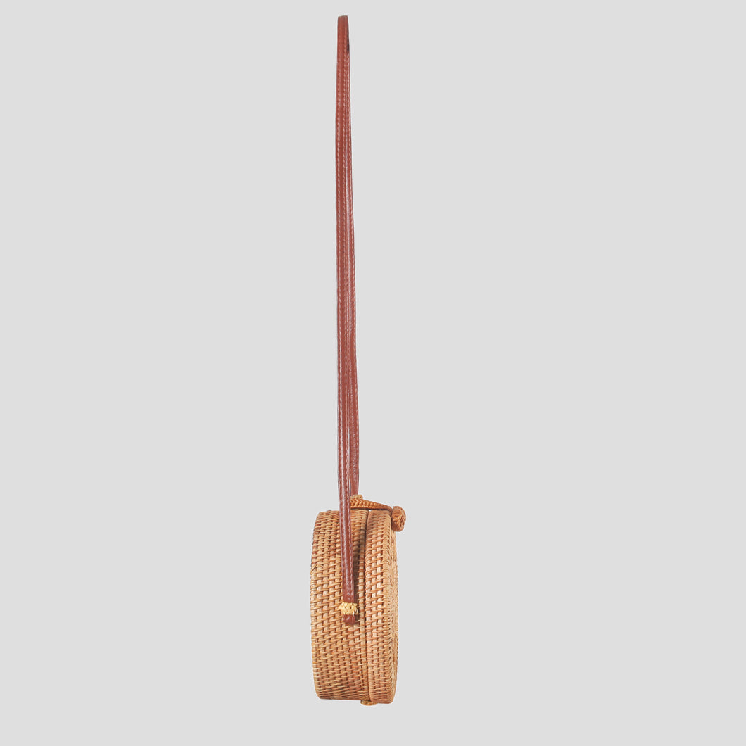 Handwoven Nature Rattan Round Shape Corss Body Bag with Geometric Detail